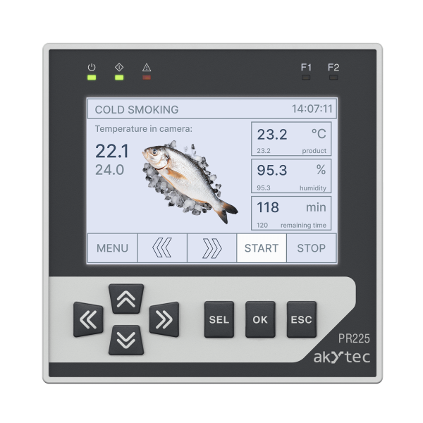 PR225.230.2.2 | Panel-mounted 3.5” controller, 230 V AC, 8DI + 8DO (8 Relay) + 4AI + 2AO, 2x RS485 (Modbus RTU/ASCII), Ethernet (Modbus TCP) |